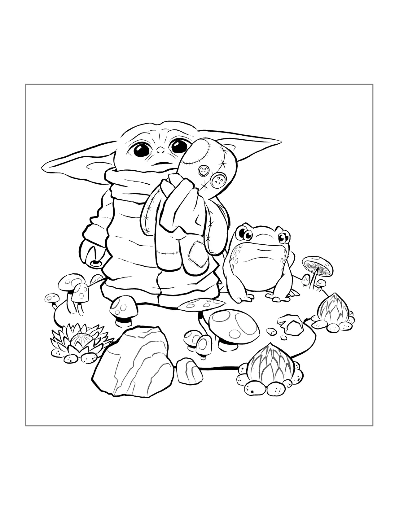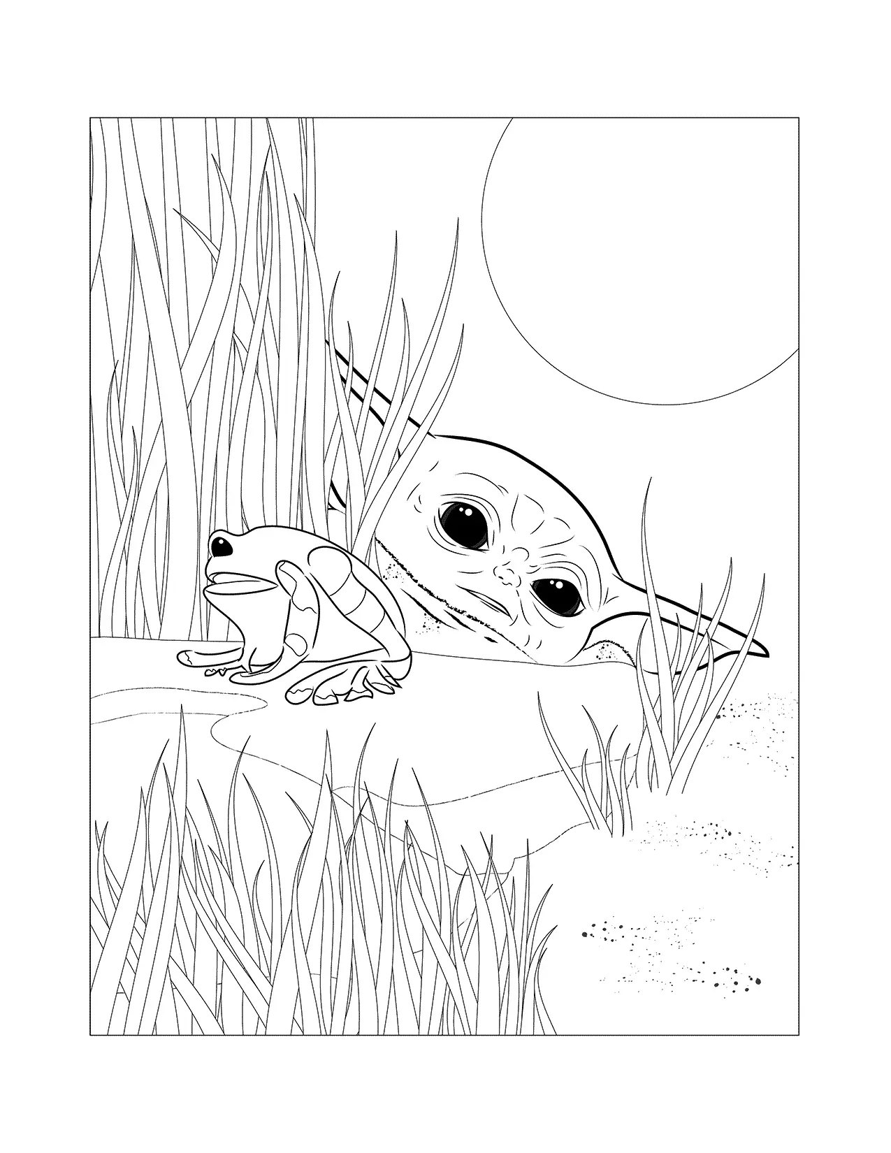 Pagina da colorare di baby yoda e rane