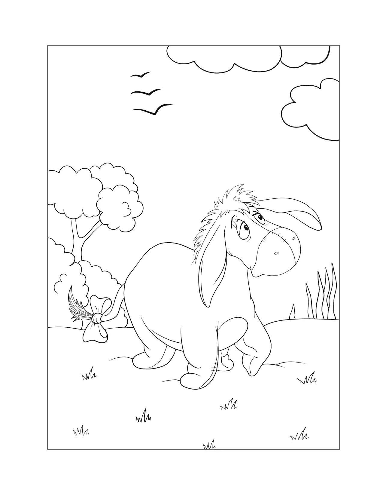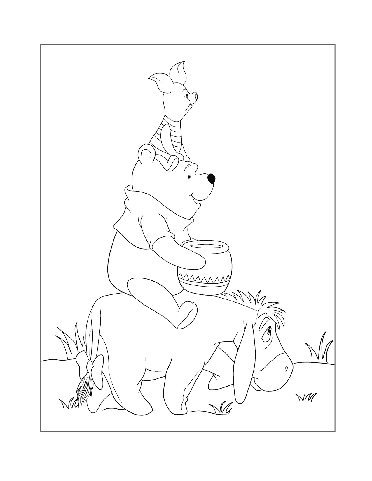 Eeyore prende Pooh e Piglet per una pagina da colorare di cavalcata