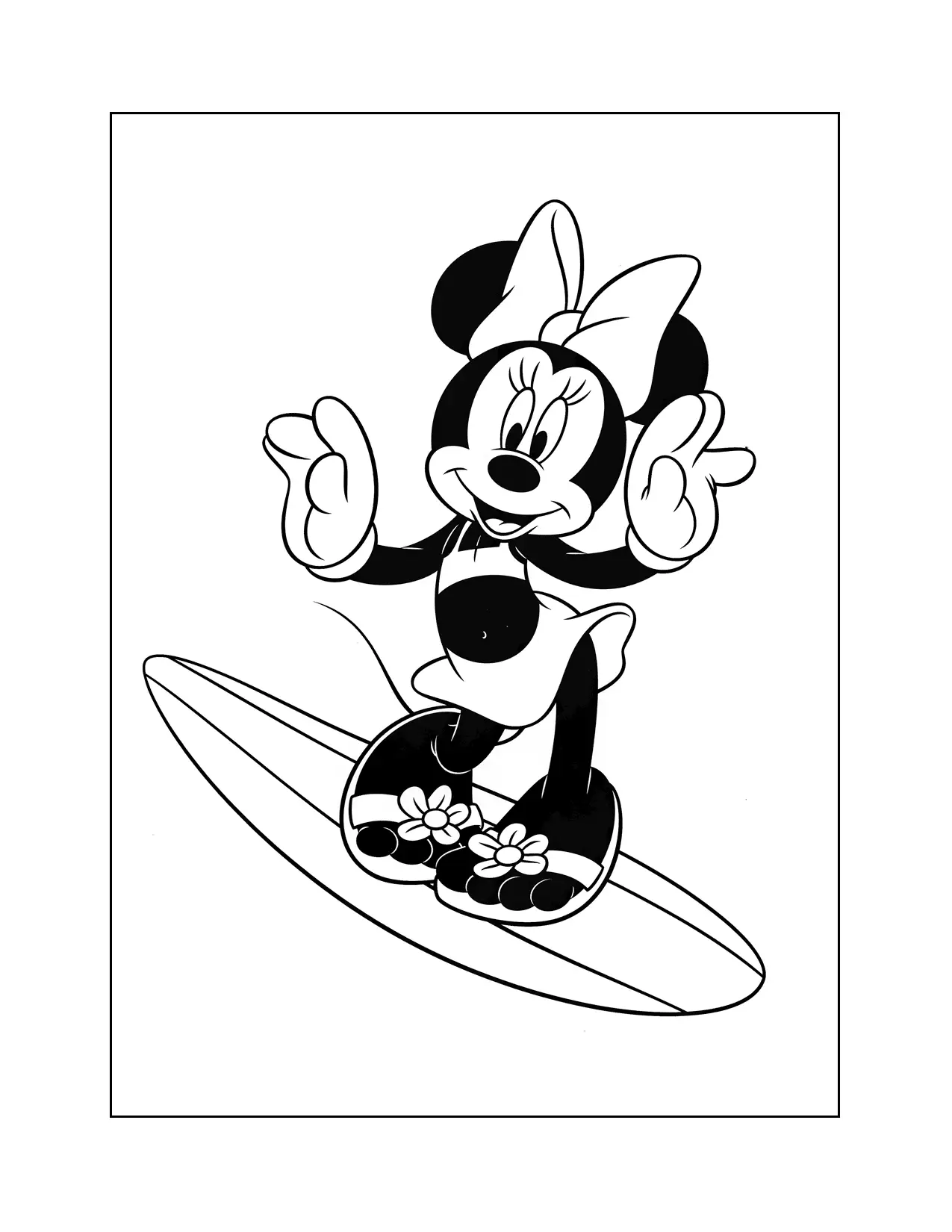 Minnie Mouse su una pagina da colorare di surf board