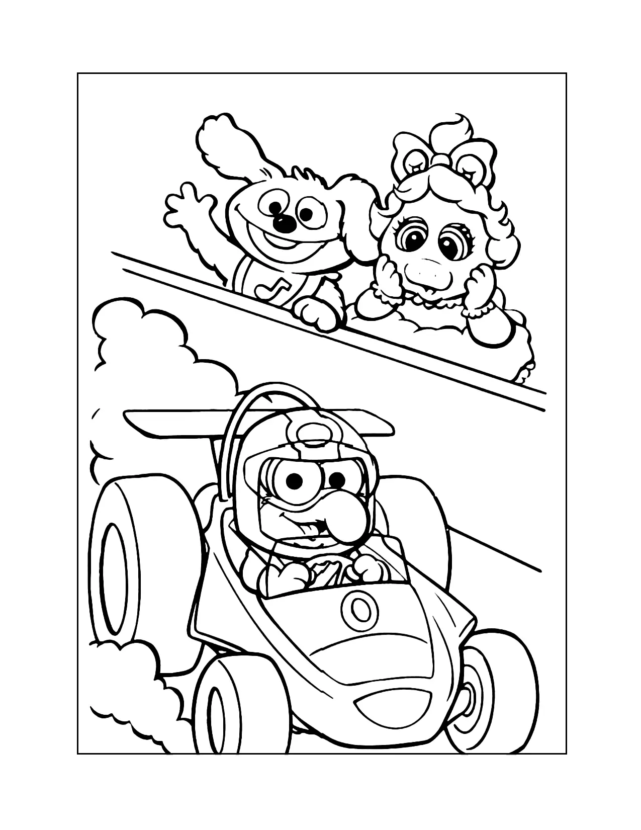 Baby Gonzo in una pagina da colorare di auto da corsa