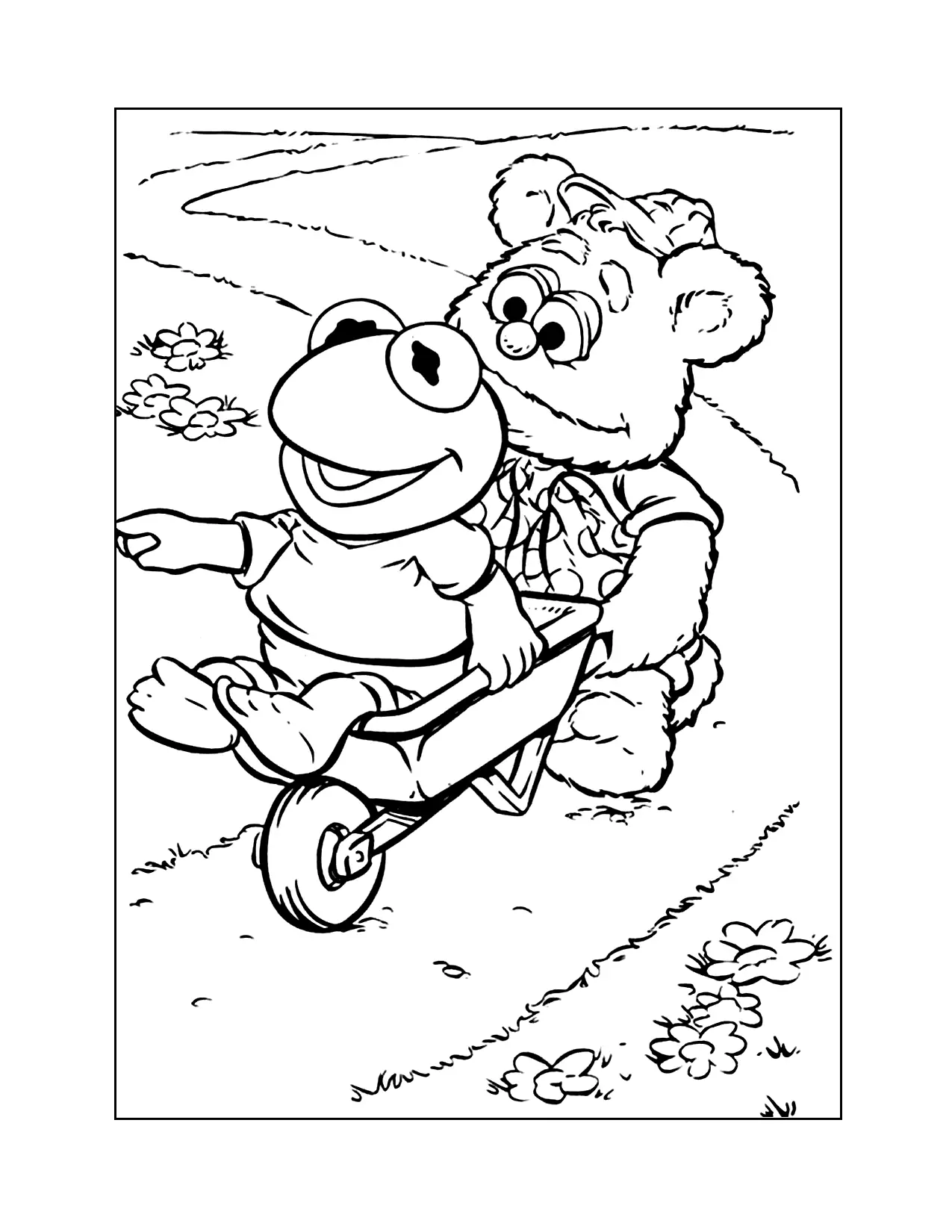 Baby fozzi che spinge kermit in una pagina da colorare