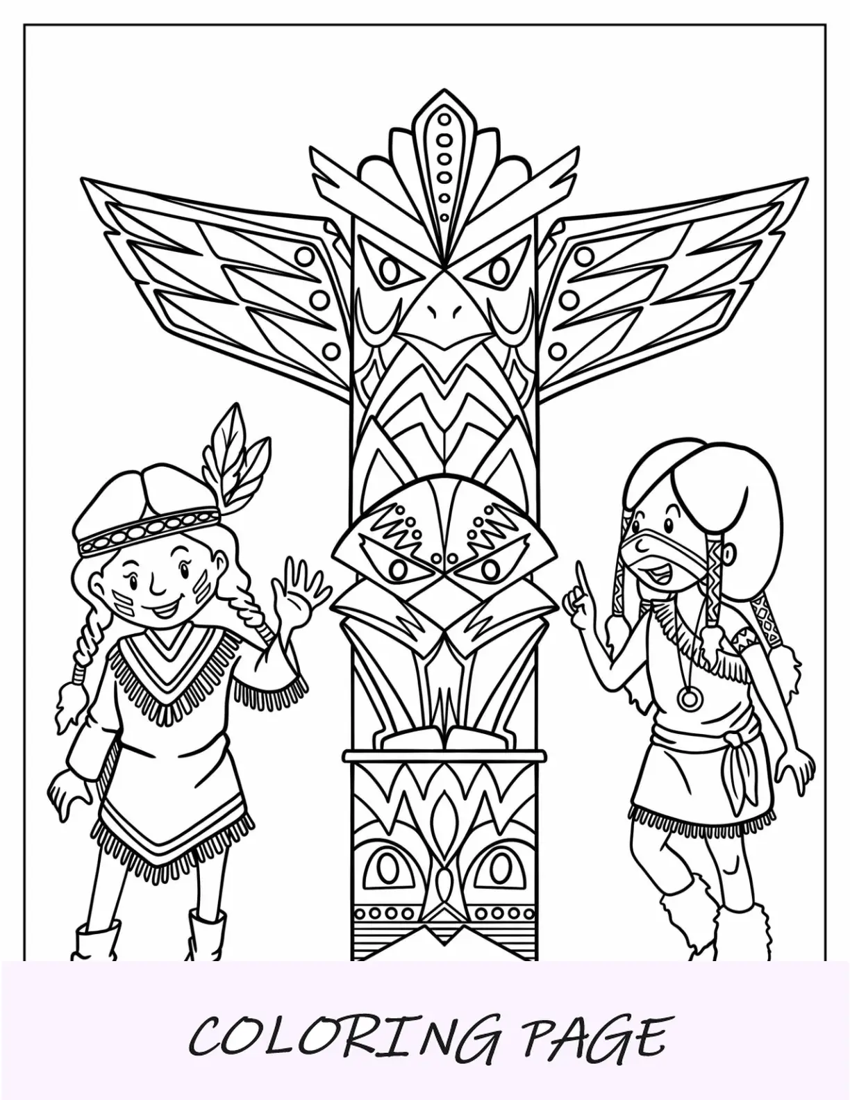 Donne native americane dei cartoni animati accanto alla pagina da colorare di Totem Pole